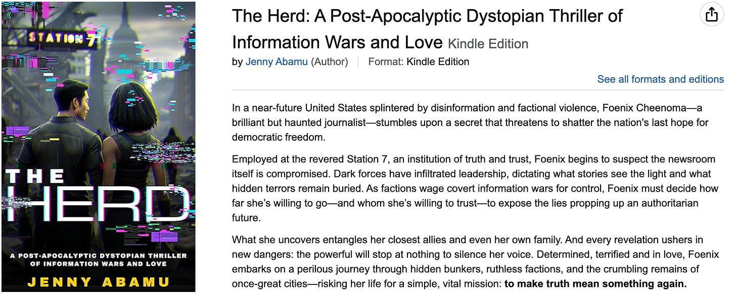 The first book in my fiction collection is The Herd, a post-apocalyptic dystopian thriller about information wars and love. This is the first book of three in the trilogy. I’ve been working on it since December 2018—nearly five years—and it’s now ready for pre-order. The book’s title references the media’s “herd mentality,” a term often known as “news judgment,” which always felt to me like being caught in a stampede.