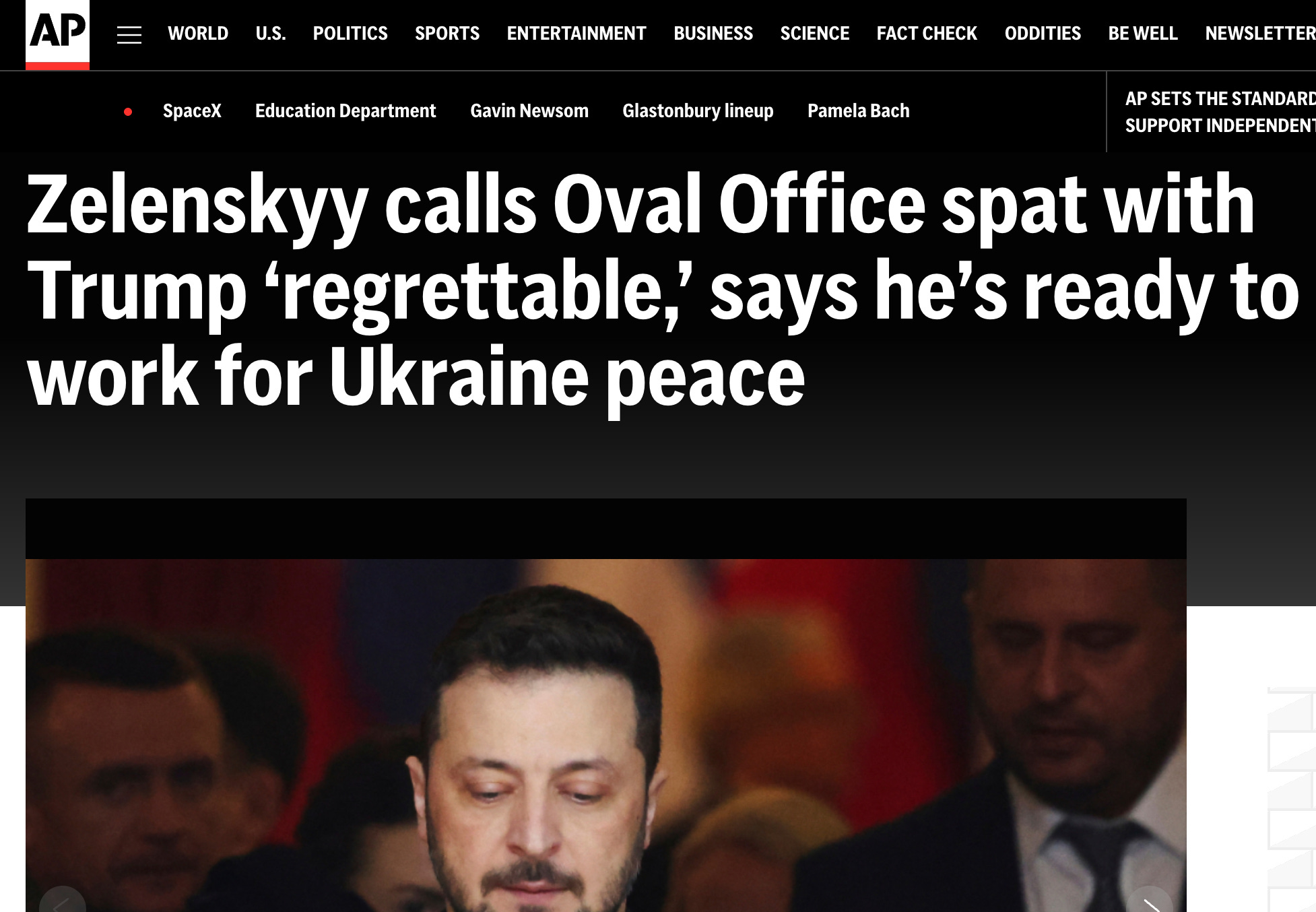 Zelenskyy calls Oval Office spat with Trump ‘regrettable,’ says he’s ready to work for Ukraine peace. AP.