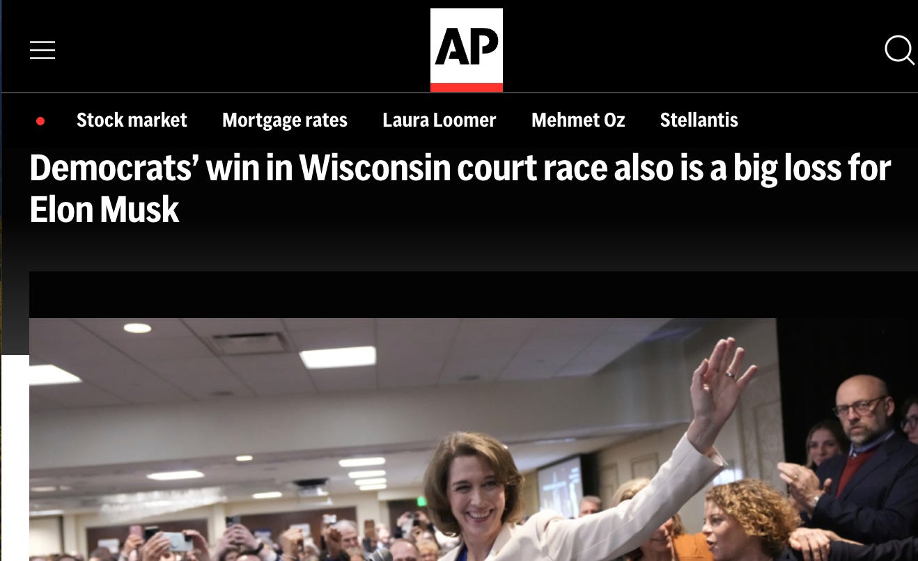 Democrats’ win in Wisconsin court race also is a big loss for Elon Musk. AP.